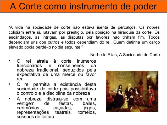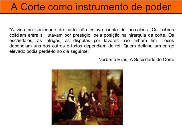 21. 21. A Corte como instrumento de poder “A vida na sociedade de corte não estava isenta de percalços. Os nobres colidiam entre si, lutavam por prestígio, pela posição na hirarquia da corte. Os escândalos, as intrigas, as disputas por favores não tinham fim. Todos dependiam uns dos outros e todos dependiam do rei. Quem detinha um cargo elevado podia perdê-lo no dia seguinte.” Norberto Elias, A Sociedade de Corte