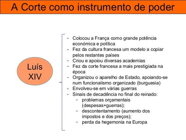 25. 25. A Corte como instrumento de poder Luís XIV - Colocou a França como grande potência económica e política - Fez da cultura francesa um modelo a copiar pelos restantes países - Criou e apoiou diversas academias - Fez da corte francesa a mais prestigiada na época - Organizou o aparelho de Estado, apoiando-se num funcionalismo organizado (burguesia) - Envolveu-se em várias guerras - Sinais de decadência no final do reinado: - problemas orçamentais (despesas+guerras); - descontentamento (aumento dos impostos e dos preços); - perda da hegemonia na Europa