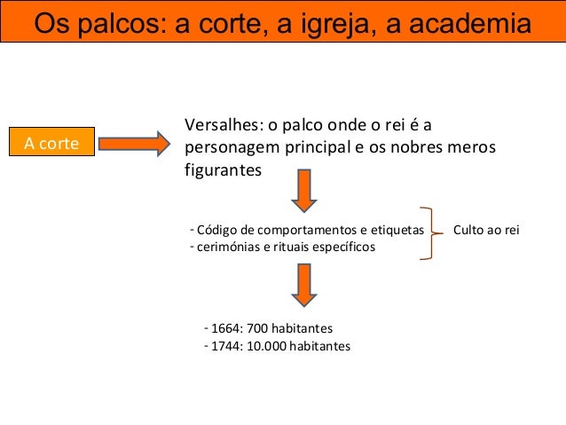 27. 27. Os palcos: a corte, a igreja, a academia A corte Versalhes: o palco onde o rei é a personagem principal e os nobres meros figurantes - Código de comportamentos e etiquetas - cerimónias e rituais específicos Culto ao rei - 1664: 700 habitantes - 1744: 10.000 habitantes