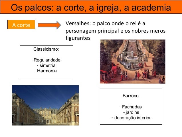 29. 29. Os palcos: a corte, a igreja, a academia A corte Versalhes: o palco onde o rei é a personagem principal e os nobres meros figurantes Classicismo: -Regularidade - simetria -Harmonia Barroco: -Fachadas - jardins - decoração interior