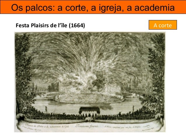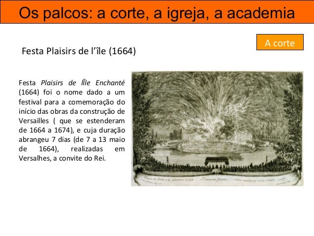 31. 31. Os palcos: a corte, a igreja, a academia Festa Plaisirs de l’île (1664) Festa Plaisirs de lÎle Enchanté (1664) foi o nome dado a um festival para a comemoração do início das obras da construção de Versailles ( que se estenderam de 1664 a 1674), e cuja duração abrangeu 7 dias (de 7 a 13 maio de 1664), realizadas em Versalhes, a convite do Rei. A corte