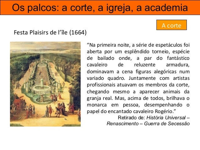 32. 32. Os palcos: a corte, a igreja, a academia A corte “Na primeira noite, a série de espetáculos foi aberta por um esplêndido torneio, espécie de bailado onde, a par do fantástico cavaleiro de reluzente armadura, dominavam a cena figuras alegóricas num variado quadro. Juntamente com artistas profissionais atuavam os membros da corte, chegando mesmo a aparecer animais da granja real. Mas, acima de todos, brilhava o monarca em pessoa, desempenhando o papel do encantado cavaleiro Rogério.” Retirado de: História Universal – Renascimento – Guerra de Secessão Festa Plaisirs de l’île (1664)