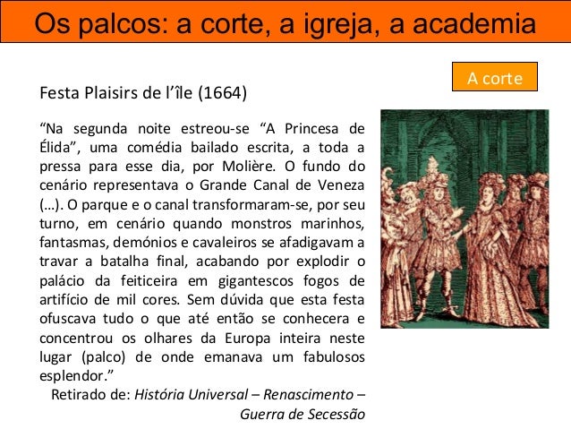 33. 33. Os palcos: a corte, a igreja, a academia “Na segunda noite estreou-se “A Princesa de Élida”, uma comédia bailado escrita, a toda a pressa para esse dia, por Molière. O fundo do cenário representava o Grande Canal de Veneza (…). O parque e o canal transformaram-se, por seu turno, em cenário quando monstros marinhos, fantasmas, demónios e cavaleiros se afadigavam a travar a batalha final, acabando por explodir o palácio da feiticeira em gigantescos fogos de artifício de mil cores. Sem dúvida que esta festa ofuscava tudo o que até então se conhecera e concentrou os olhares da Europa inteira neste lugar (palco) de onde emanava um fabulosos esplendor.” Retirado de: História Universal – Renascimento – Guerra de Secessão A corte Festa Plaisirs de l’île (1664)