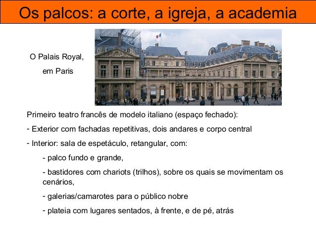 35. 35. Os palcos: a corte, a igreja, a academia O Palais Royal, em Paris Primeiro teatro francês de modelo italiano (espaço fechado): - Exterior com fachadas repetitivas, dois andares e corpo central - Interior: sala de espetáculo, retangular, com: - palco fundo e grande, - bastidores com chariots (trilhos), sobre os quais se movimentam os cenários, - galerias/camarotes para o público nobre - plateia com lugares sentados, à frente, e de pé, atrás