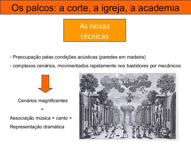 36. 36. Os palcos: a corte, a igreja, a academia As novas técnicas - Preocupação pelas condições acústicas (paredes em madeira) - complexos cenários, movimentados rapidamente nos bastidores por mecânicos Cenários magnificentes + Associação música + canto + Representação dramática