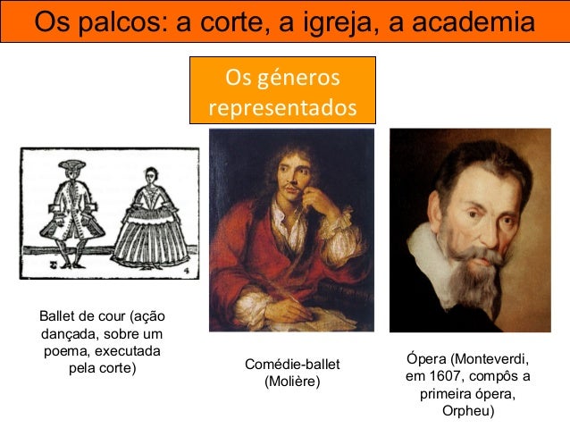 37. 37. Os palcos: a corte, a igreja, a academia Os géneros representados Ópera (Monteverdi, em 1607, compôs a primeira ópera, Orpheu) Comédie-ballet (Molière) Ballet de cour (ação dançada, sobre um poema, executada pela corte)