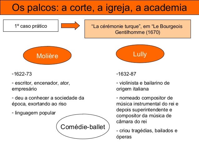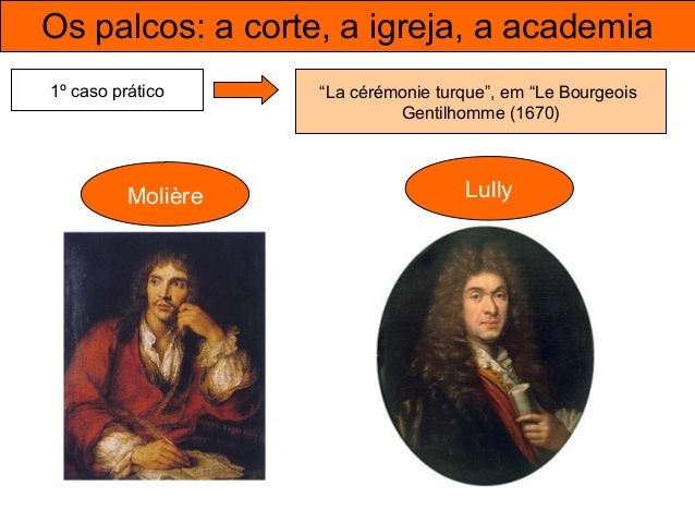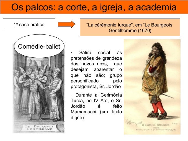 40. 40. Os palcos: a corte, a igreja, a academia 1º caso prático “La cérémonie turque”, em “Le Bourgeois Gentilhomme (1670) Comédie-ballet - Sátira social às pretensões de grandeza dos novos ricos, que desejam aparentar o que não são; grupo personificado pelo protagonista, Sr. Jordão - Durante a Cerimónia Turca, no IV Ato, o Sr. Jordão é feito Mamamuchi (um título digno)