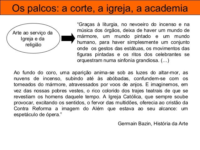 42. 42. Os palcos: a corte, a igreja, a academia Arte ao serviço da Igreja e da religião “Graças à liturgia, no nevoeiro do incenso e na música dos órgãos, deixa de haver um mundo de mármore, um mundo pintado e um mundo humano, para haver simplesmente um conjunto onde os gestos das estátuas, os movimentos das figuras pintadas e os ritos dos celebrantes se orquestram numa sinfonia grandiosa. (…) Ao fundo do coro, uma aparição anima-se sob as luzes do altar-mor, as nuvens de incenso, subindo até às abóbadas, confundem-se com os torneados do mármore, atravessados por voos de anjos. E imaginemos, em vez das nossas pobres vestes, o rico colorido dos trajes teatrais de que se revestiam os homens daquele tempo. A Igreja Católica, que sempre soube provocar, excitando os sentidos, o fervor das multidões, oferecia ao cristão da Contra Reforma a imagem do Além que estava ao seu alcance: um espetáculo de ópera.” Germain Bazin, História da Arte
