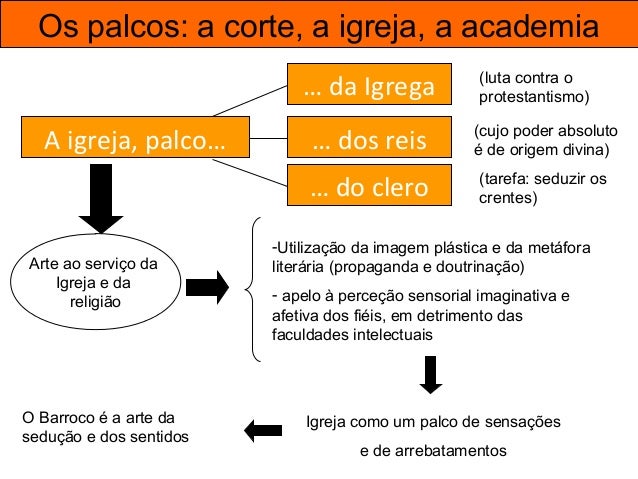 43. 43. Os palcos: a corte, a igreja, a academia A igreja, palco… … da Igrega … dos reis … do clero (luta contra o protestantismo) (cujo poder absoluto é de origem divina) (tarefa: seduzir os crentes) Arte ao serviço da Igreja e da religião -Utilização da imagem plástica e da metáfora literária (propaganda e doutrinação) - apelo à perceção sensorial imaginativa e afetiva dos fiéis, em detrimento das faculdades intelectuais Igreja como um palco de sensações e de arrebatamentos O Barroco é a arte da sedução e dos sentidos
