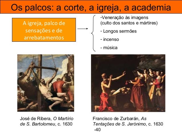 44. 44. Os palcos: a corte, a igreja, a academia A igreja, palco de sensações e de arrebatamentos -Veneração às imagens (culto dos santos e mártires) - Longos sermões - incenso - música José de Ribera, O Martírio de S. Bartolomeu, c. 1630 Francisco de Zurbarán, As Tentações de S. Jerónimo, c. 1630 -40