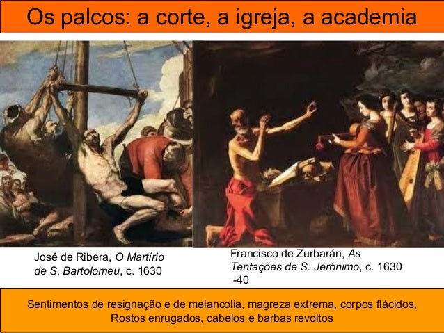 46. 46. Os palcos: a corte, a igreja, a academia José de Ribera, O Martírio de S. Bartolomeu, c. 1630 Francisco de Zurbarán, As Tentações de S. Jerónimo, c. 1630 -40 Sentimentos de resignação e de melancolia, magreza extrema, corpos flácidos, Rostos enrugados, cabelos e barbas revoltos
