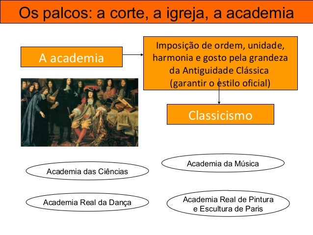 47. 47. Os palcos: a corte, a igreja, a academia A academia Imposição de ordem, unidade, harmonia e gosto pela grandeza da Antiguidade Clássica (garantir o estilo oficial) Classicismo Academia da Música Academia das Ciências Academia Real de Pintura e Escultura de Paris Academia Real da Dança