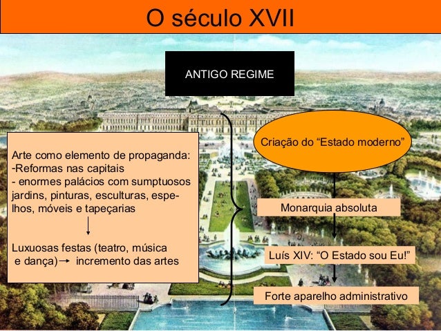 5. 5. O século XVII ANTIGO REGIME Criação do “Estado moderno” Monarquia absoluta Luís XIV: “O Estado sou Eu!” Forte aparelho administrativo Arte como elemento de propaganda: -Reformas nas capitais - enormes palácios com sumptuosos jardins, pinturas, esculturas, espe-lhos, móveis e tapeçarias Luxuosas festas (teatro, música e dança) incremento das artes