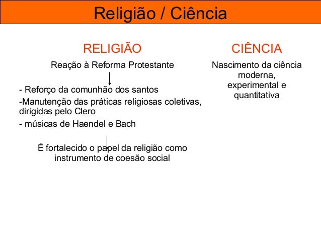 55. 55. Religião / Ciência RELIGIÃO CIÊNCIA Reação à Reforma Protestante - Reforço da comunhão dos santos -Manutenção das práticas religiosas coletivas, dirigidas pelo Clero - músicas de Haendel e Bach É fortalecido o papel da religião como instrumento de coesão social Nascimento da ciência moderna, experimental e quantitativa
