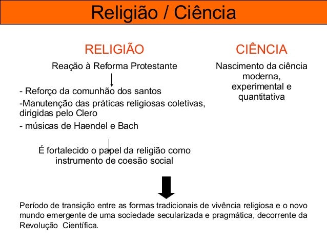 56. 56. Religião / Ciência RELIGIÃO CIÊNCIA Reação à Reforma Protestante - Reforço da comunhão dos santos -Manutenção das práticas religiosas coletivas, dirigidas pelo Clero - músicas de Haendel e Bach É fortalecido o papel da religião como instrumento de coesão social Nascimento da ciência moderna, experimental e quantitativa Período de transição entre as formas tradicionais de vivência religiosa e o novo mundo emergente de uma sociedade secularizada e pragmática, decorrente da Revolução Científica.