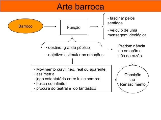 57. 57. Arte barroca Barroco Função - fascinar pelos sentidos - veículo de uma mensagem ideológica - destino: grande público - objetivo: estimular as emoções - Movimento curvilíneo, real ou aparente - assimetria - jogo ostentatório entre luz e sombra - busca do infinito - procura do teatral e do fantástico Predominância da emoção e não da razão Oposição ao Renascimento