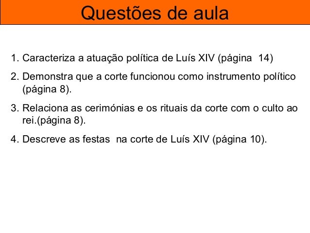 58. 58. Questões de aula 1. Caracteriza a atuação política de Luís XIV (página 14) 2. Demonstra que a corte funcionou como instrumento político (página 8). 3. Relaciona as cerimónias e os rituais da corte com o culto ao rei.(página 8). 4. Descreve as festas na corte de Luís XIV (página 10).