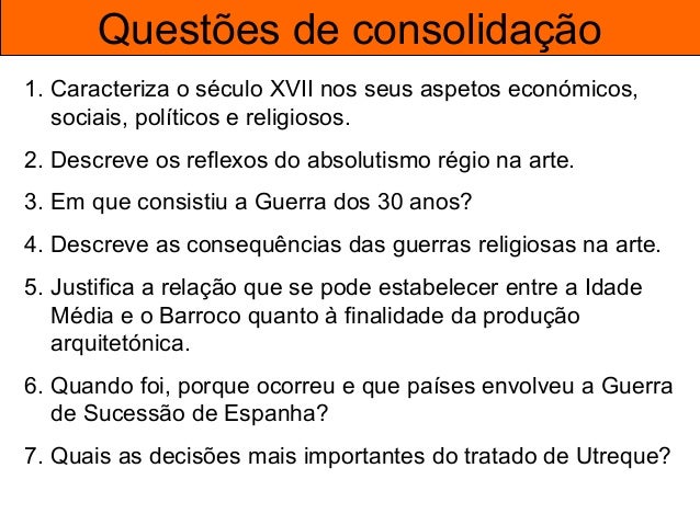 59. 59. Questões de consolidação 1. Caracteriza o século XVII nos seus aspetos económicos, sociais, políticos e religiosos. 2. Descreve os reflexos do absolutismo régio na arte. 3. Em que consistiu a Guerra dos 30 anos? 4. Descreve as consequências das guerras religiosas na arte. 5. Justifica a relação que se pode estabelecer entre a Idade Média e o Barroco quanto à finalidade da produção arquitetónica. 6. Quando foi, porque ocorreu e que países envolveu a Guerra de Sucessão de Espanha? 7. Quais as decisões mais importantes do tratado de Utreque?