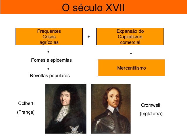 6. 6. O século XVII Frequentes Crises agrícolas Fomes e epidemias Expansão do Capitalismo comercial + + Mercantilismo Colbert (França) Cromwell (Inglaterra) Revoltas populares