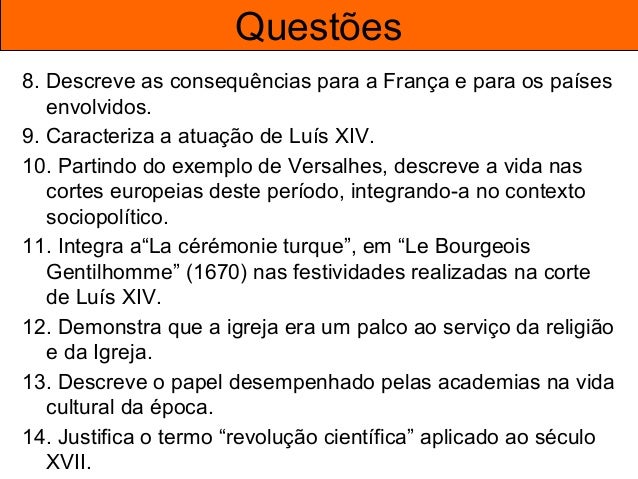 60. 60. Questões 8. Descreve as consequências para a França e para os países envolvidos. 9. Caracteriza a atuação de Luís XIV. 10. Partindo do exemplo de Versalhes, descreve a vida nas cortes europeias deste período, integrando-a no contexto sociopolítico. 11. Integra a“La cérémonie turque”, em “Le Bourgeois Gentilhomme” (1670) nas festividades realizadas na corte de Luís XIV. 12. Demonstra que a igreja era um palco ao serviço da religião e da Igreja. 13. Descreve o papel desempenhado pelas academias na vida cultural da época. 14. Justifica o termo “revolução científica” aplicado ao século XVII.