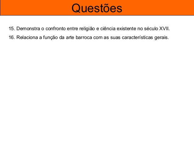 61. 61. Questões 15. Demonstra o confronto entre religião e ciência existente no século XVII. 16. Relaciona a função da arte barroca com as suas características gerais.