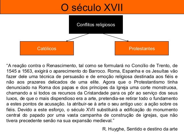 9. 9. O século XVII Conflitos religiosos Católicos Protestantes “A reação contra o Renascimento, tal como se formulará no Concílio de Trento, de 1545 a 1563, exigirá o aparecimento do Barroco. Roma, Espanha e os Jesuítas vão fazer dele uma técnica de persuasão e de emoção religiosa destinada aos fiéis e não aos prazeres delicados de uma elite. Agora que o Protestantismo tinha denunciado na Roma dos papas e dos príncipes da Igreja uma corte monstruosa, chamando a si todos os recursos da Cristandade para os pôr ao serviço dos seus luxos, de que o mais dispendioso era a arte, pretendia-se retirar todo o fundamento a estes pontos de acusação. Ia atribuir-se à arte o seu antigo uso: a ação sobre os fiéis. Devido a este esforço, o século XVII substituirá a edificação do monumento central do papado por uma vasta campanha de construção de igrejas, que não tivera precedente senão na sua expansão medieval.” R. Huyghe, Sentido e destino da arte