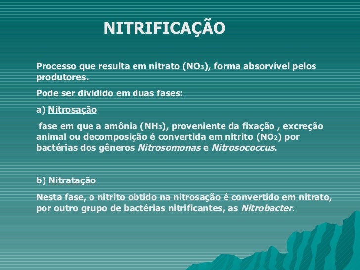 11. 11. NITRIFICAÇÃO Processo que resulta em nitrato (NO 3 ), forma absorvível pelos produtores. Pode ser dividido em duas fases: a) Nitrosação fase em que a amônia (NH 3 ), proveniente da fixação , excreção animal ou decomposição é convertida em nitrito (NO 2 ) por bactérias dos gêneros Nitrosomonas e Nitrosococcus . b) Nitratação Nesta fase, o nitrito obtido na nitrosação é convertido em nitrato, por outro grupo de bactérias nitrificantes, as Nitrobacter .