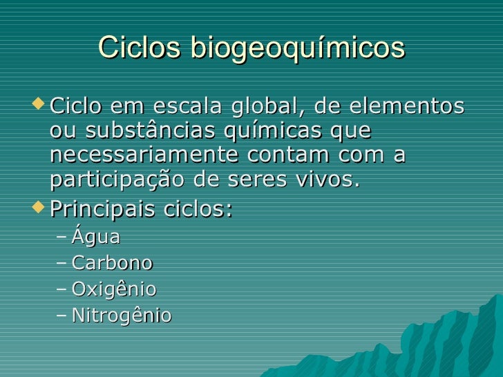 2. 2. Ciclos biogeoquímicos <ul><li>Ciclo em escala global, de elementos ou substâncias químicas que necessariamente contam com a participação de seres vivos. </li></ul><ul><li>Principais ciclos: </li></ul><ul><ul><li>Água </li></ul></ul><ul><ul><li>Carbono </li></ul></ul><ul><ul><li>Oxigênio </li></ul></ul><ul><ul><li>Nitrogênio </li></ul></ul>