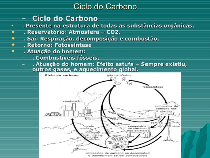 4. 4. Ciclo do Carbono <ul><ul><li>Ciclo do Carbono </li></ul></ul><ul><li>. Presente na estrutura de todas as substâncias orgânicas. </li></ul><ul><li>. Reservatório: Atmosfera – CO2. </li></ul><ul><li>. Sai: Respiração, decomposição e combustão. </li></ul><ul><li>. Retorno: Fotossíntese </li></ul><ul><li>. Atuação do homem: </li></ul><ul><ul><li>. Combustíveis fósseis. </li></ul></ul><ul><ul><li>. Atuação do homem: Efeito estufa – Sempre existiu, outros gases, e aquecimento global. </li></ul></ul>