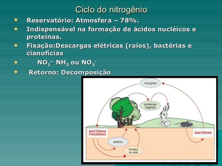 6. 6. Ciclo do nitrogênio <ul><li>Reservatório: Atmosfera – 78%. </li></ul><ul><li>Indispensável na formação de ácidos nucléicos e proteínas. </li></ul><ul><li>Fixação:Descargas elétricas (raios), bactérias e cianofícias </li></ul><ul><li>NO 2 -- NH 3 ou NO 3 - </li></ul><ul><li>Retorno: Decomposição </li></ul>