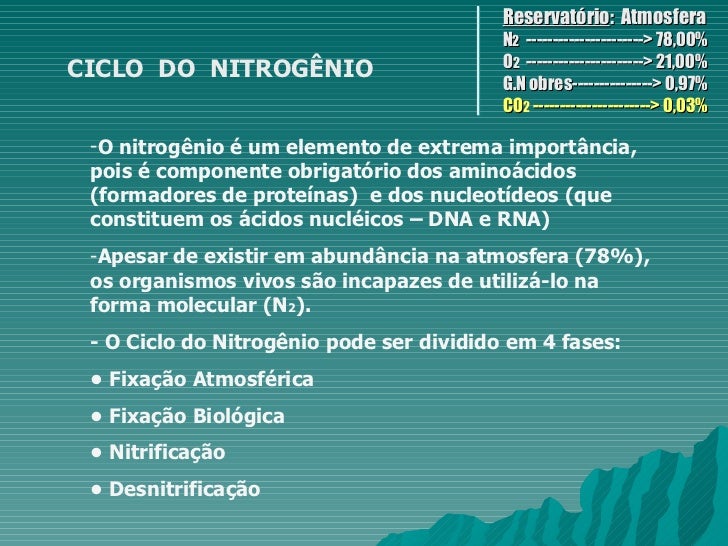 7. 7. CICLO DO NITROGÊNIO <ul><li>O nitrogênio é um elemento de extrema importância, pois é componente obrigatório dos aminoácidos (formadores de proteínas) e dos nucleotídeos (que constituem os ácidos nucléicos – DNA e RNA) </li></ul><ul><li>Apesar de existir em abundância na atmosfera (78%), os organismos vivos são incapazes de utilizá-lo na forma molecular (N 2 ). </li></ul><ul><li>- O Ciclo do Nitrogênio pode ser dividido em 4 fases: </li></ul><ul><li>• Fixação Atmosférica </li></ul><ul><li>• Fixação Biológica </li></ul><ul><li>• Nitrificação </li></ul><ul><li>• Desnitrificação </li></ul>Reservatório : Atmosfera N 2 ----------------------> 78,00% O 2 ----------------------> 21,00% G.N obres---------------> 0,97% CO 2 ----------------------> 0,03%