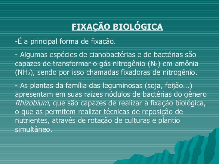9. 9. FIXAÇÃO BIOLÓGICA <ul><li>É a principal forma de fixação. </li></ul><ul><li>- Algumas espécies de cianobactérias e de bactérias são capazes de transformar o gás nitrogênio (N 2 ) em amônia (NH 3 ), sendo por isso chamadas fixadoras de nitrogênio. </li></ul><ul><li>- As plantas da família das leguminosas (soja, feijão...) apresentam em suas raízes nódulos de bactérias do gênero Rhizobium , que são capazes de realizar a fixação biológica, o que as permitem realizar técnicas de reposição de nutrientes, através de rotação de culturas e plantio simultâneo. </li></ul>