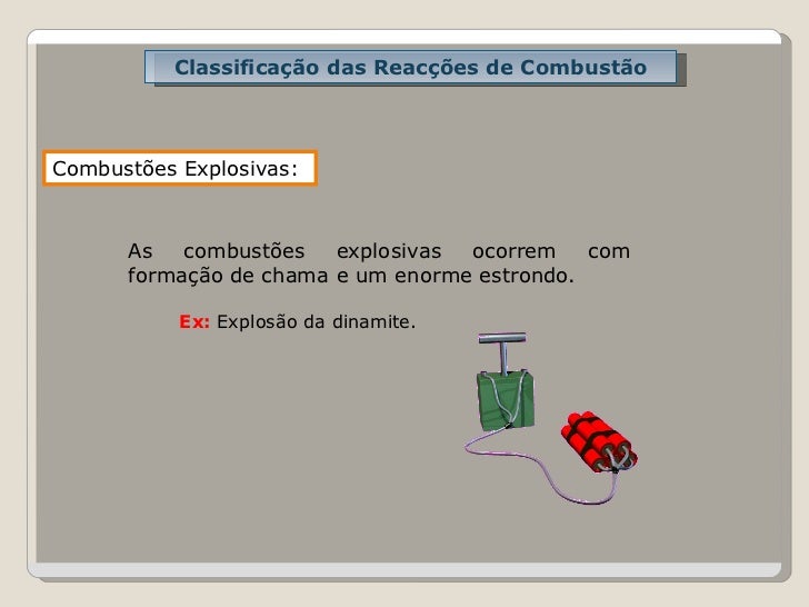 10. 11. Classificação das Reacções de Combustão   Ex: Explosão da dinamite. Combustões Explosivas: As combustões explosivas ocorrem com formação de chama e um enorme estrondo.