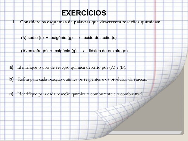 11. 12. EXERCÍCIOS (A) sódio (s) + oxigénio (g)  óxido de sódio (s) (B) enxofre (s) + oxigénio (g)  dióxido de enxofre (s) 1 Considere os esquemas de palavras que descrevem reacções químicas: a) Identifique o tipo de reacção química descrito por (A) e (B). b) Refira para cada reacção química os reagentes e os produtos da reacção. c) Identifique para cada reacção química o comburente e o combustível.