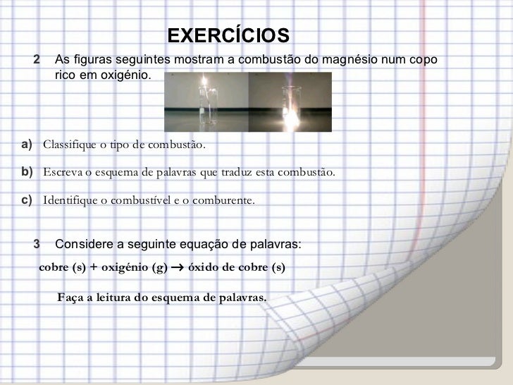 12. 13. EXERCÍCIOS cobre (s) + oxigénio (g)  óxido de cobre (s) Faça a leitura do esquema de palavras. 2 As figuras seguintes mostram a combustão do magnésio num copo rico em oxigénio. a) Classifique o tipo de combustão. b) Escreva o esquema de palavras que traduz esta combustão. c) Identifique o combustível e o comburente. 3 Considere a seguinte equação de palavras: