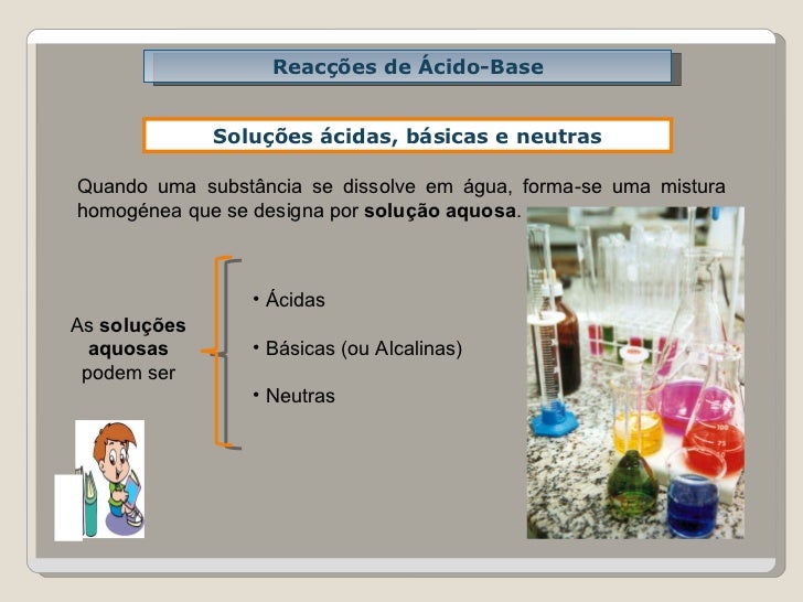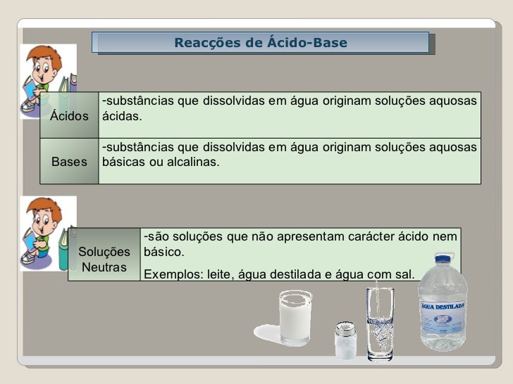 13. 14. Reacções de Ácido-Base Ácidos <ul><li>substâncias que dissolvidas em água originam soluções aquosas ácidas. </li></ul>Bases <ul><li>substâncias que dissolvidas em água originam soluções aquosas básicas ou alcalinas. </li></ul>Soluções Neutras <ul><li>são soluções que não apresentam carácter ácido nem básico. </li></ul><ul><li>Exemplos: leite, água destilada e água com sal. </li></ul>