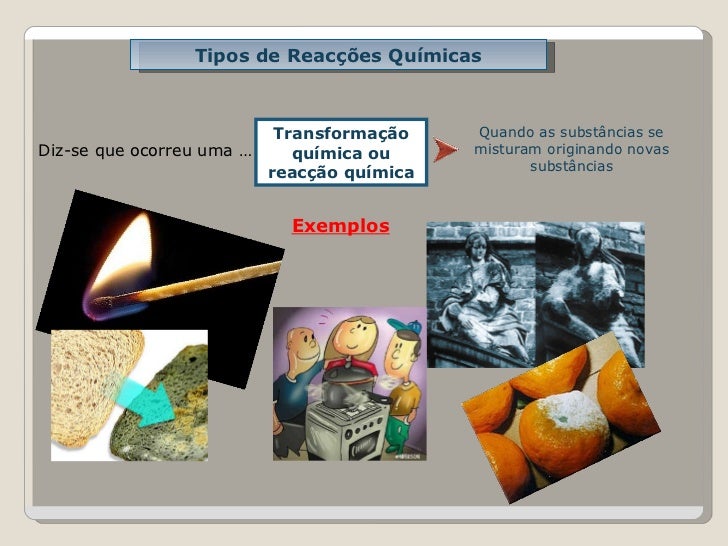 1. 2. Tipos de Reacções Químicas Transformação química ou reacção química Diz-se que ocorreu uma … Quando as substâncias se misturam originando novas substâncias Exemplos