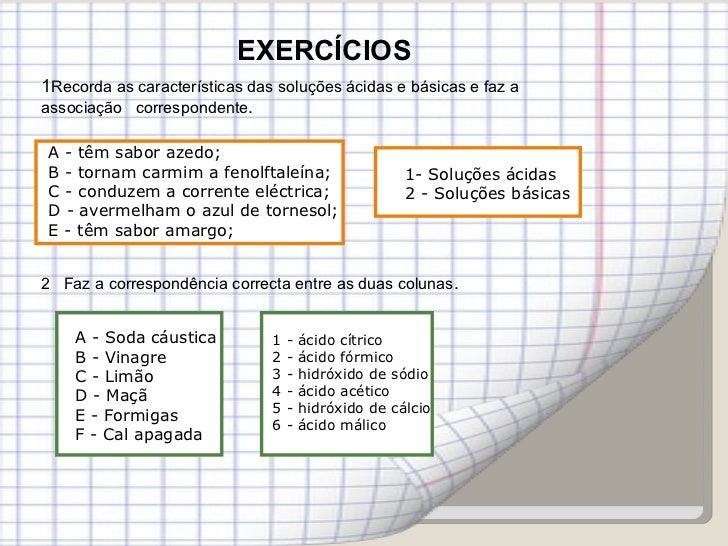 19. 20. EXERCÍCIOS A - têm sabor azedo; B - tornam carmim a fenolftaleína; C - conduzem a corrente eléctrica; D - avermelham o azul de tornesol; E - têm sabor amargo; 1- Soluções ácidas 2 - Soluções básicas A - Soda cáustica B - Vinagre C - Limão D - Maçã E - Formigas F - Cal apagada 1 - ácido cítrico 2 - ácido fórmico 3 - hidróxido de sódio 4 - ácido acético 5 - hidróxido de cálcio 6 - ácido málico 1 Recorda as características das soluções ácidas e básicas e faz a associação correspondente . 2 Faz a correspondência correcta entre as duas colunas .