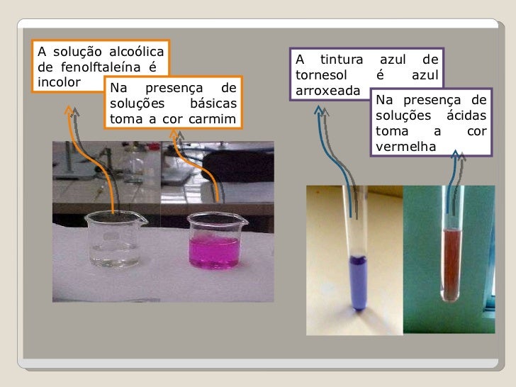 21. 22. A solução alcoólica de fenolftaleína é incolor Na presença de soluções básicas toma a cor carmim A tintura azul de tornesol é azul arroxeada Na presença de soluções ácidas toma a cor vermelha