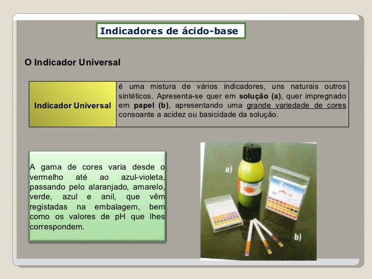 22. 23. O Indicador Universal Indicadores de ácido-base Indicador Universal é uma mistura de vários indicadores, uns naturais outros sintéticos. Apresenta-se quer em solução (a) , quer impregnado em papel (b) , apresentando uma grande variedade de cores consoante a acidez ou basicidade da solução. A gama de cores varia desde o vermelho até ao azul-violeta, passando pelo alaranjado, amarelo, verde, azul e anil, que vêm registadas na embalagem, bem como os valores de pH que lhes correspondem.