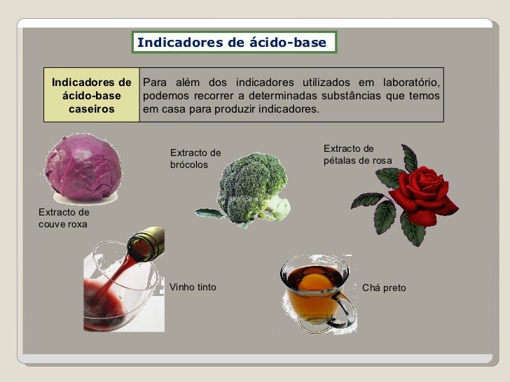 23. 24. Indicadores de ácido-base Extracto de couve roxa Extracto de brócolos Extracto de pétalas de rosa Chá preto Vinho tinto Indicadores de ácido-base caseiros Para além dos indicadores utilizados em laboratório, podemos recorrer a determinadas substâncias que temos em casa para produzir indicadores.