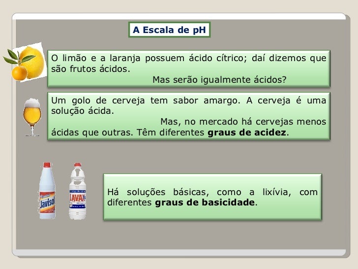 24. 25. A Escala de pH Há soluções básicas, como a lixívia, com diferentes graus de basicidade . O limão e a laranja possuem ácido cítrico; daí dizemos que são frutos ácidos. Mas serão igualmente ácidos? Um golo de cerveja tem sabor amargo. A cerveja é uma solução ácida. Mas, no mercado há cervejas menos ácidas que outras. Têm diferentes graus de acidez .
