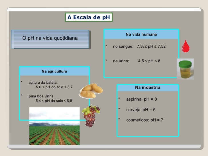 26. 27. O pH na vida quotidiana A Escala de pH Na indústria <ul><li>aspirina: pH = 8 </li></ul><ul><li>cerveja: pH = 5 </li></ul><ul><li>cosméticos: pH = 7 </li></ul>Na agricultura <ul><li>cultura da batata: </li></ul><ul><li>5,0  pH do solo  5,7 </li></ul><ul><li>para boa vinha: </li></ul><ul><li>5,4  pH do solo  6,8 </li></ul>Na vida humana <ul><li>no sangue: 7,38  pH  7,52 </li></ul><ul><li>na urina: 4,5  pH  8 </li></ul>