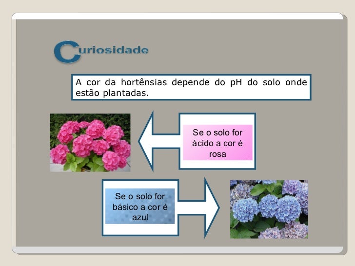 27. 28. A cor da hortênsias depende do pH do solo onde estão plantadas. Se o solo for ácido a cor é rosa Se o solo for básico a cor é azul