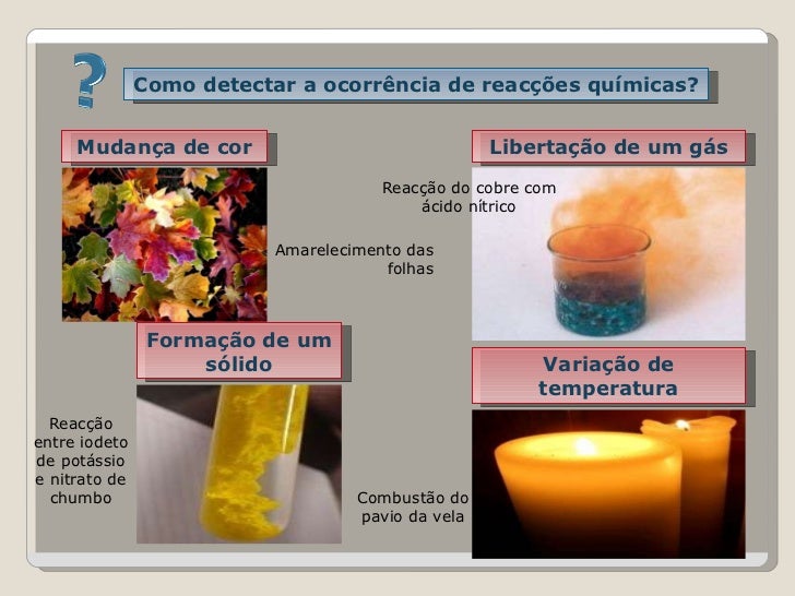 2. 3. Como detectar a ocorrência de reacções químicas? Mudança de cor Libertação de um gás Formação de um sólido Variação de temperatura Reacção do cobre com ácido nítrico Amarelecimento das folhas Combustão do pavio da vela Reacção entre iodeto de potássio e nitrato de chumbo