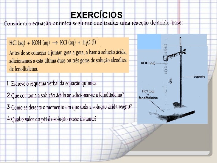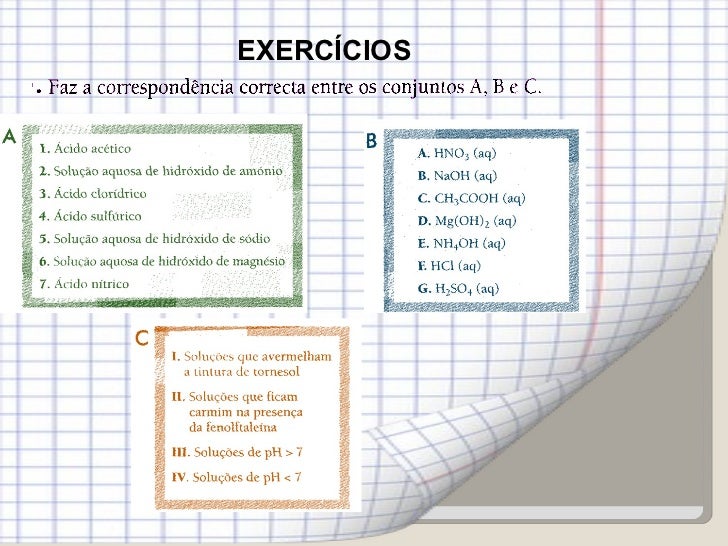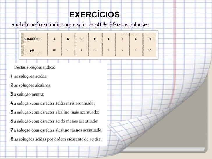 40. 42. EXERCÍCIOS <ul><li>Considera um tubo de ensaio A contendo uma solução de pH 3, um tubo B contendo uma solução de pH 12 e um tubo C com uma solução de pH 7. </li></ul><ul><li>A B </li></ul><ul><li>C </li></ul><ul><li>Indica o carácter químico da solução A e B respectivamente. </li></ul><ul><li>b) Explica como variaria o pH da solução B se lhe adicionasses, </li></ul><ul><li>progressivamente, a solução A. </li></ul>
