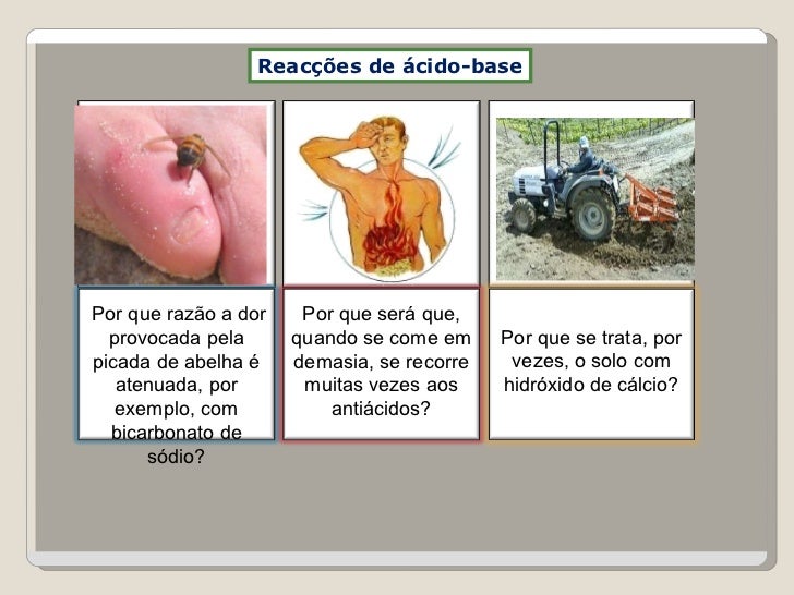 31. 32. Reacções de ácido-base Por que razão a dor provocada pela picada de abelha é atenuada, por exemplo, com bicarbonato de sódio? Por que será que, quando se come em demasia, se recorre muitas vezes aos antiácidos? Por que se trata, por vezes, o solo com hidróxido de cálcio?