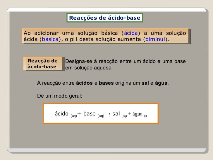 32. 33. ácido (aq) + base (aq)  sal (aq) + água (l) Reacções de ácido-base Reacção de àcido-base . Designa-se à reacção entre um ácido e uma base em solução aquosa Ao adicionar uma solução básica ( ácida ) a uma solução ácida ( básica ), o pH desta solução aumenta ( diminui ). A reacção entre ácidos e bases origina um sal e água . De um modo geral :