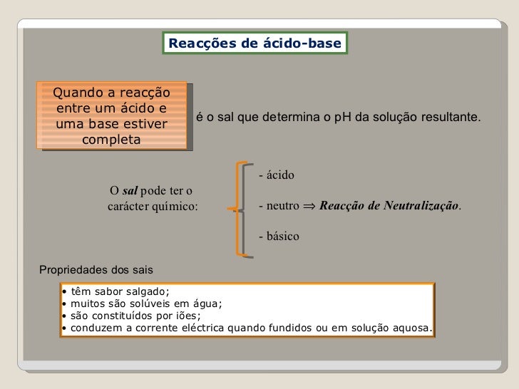 33. 34. Quando a reacção entre um ácido e uma base estiver completa Reacções de ácido-base é o sal que determina o pH da solução resultante. Propriedades dos sais O sal pode ter o carácter químico: - ácido - neutro  Reacção de Neutralização . - básico <ul><li>têm sabor salgado; </li></ul><ul><li>muitos são solúveis em água; </li></ul><ul><li>são constituídos por iões; </li></ul><ul><li>conduzem a corrente eléctrica quando fundidos ou em solução aquosa. </li></ul>