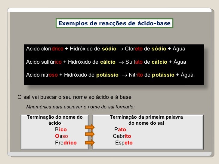 34. 35. Exemplos de reacções de ácido-base Mnemónica para escrever o nome do sal formado: Terminação do nome do ácido O sal vai buscar o seu nome ao ácido e à base Terminação da primeira palavra do nome do sal B ico P ato O s so Cabr ito Fre drico Esp eto Ácido clorí drico + Hidróxido de sódio  Clor eto de sódio + Água Ácido sulfúr ico + Hidróxido de cálcio  Sulf ato de cálcio + Água Ácido nitr oso + Hidróxido de potássio  Nitr ito de potássio + Água